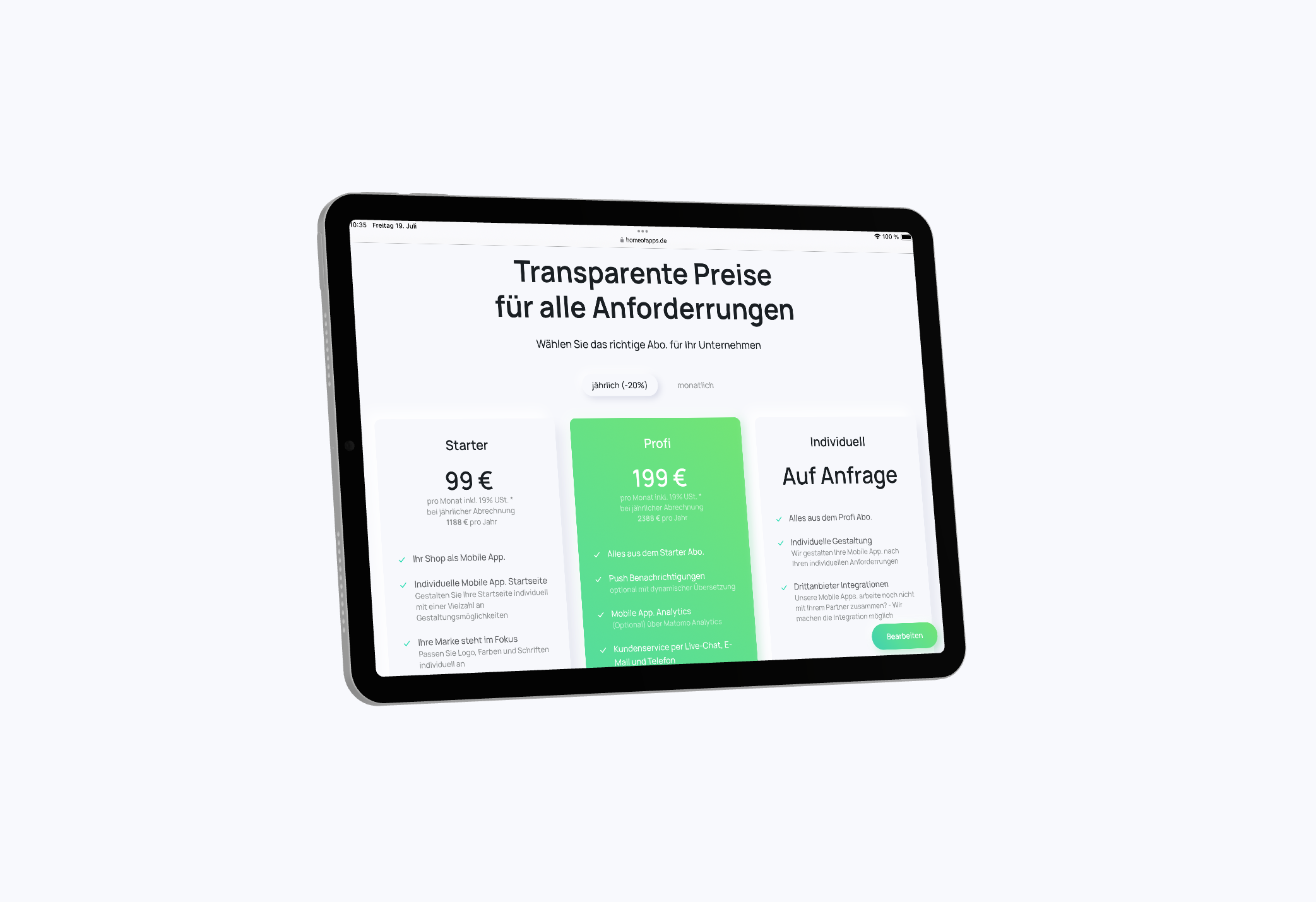 Wähle das Abo, das am besten zu deinen Bedürfnissen passt: Starter bietet dir die grundlegenden Funktionen, während das Profi-Abo mit erweiterten Features wie Push-Benachrichtigungen überzeugt. Wenn du spezielle Anforderungen hast, passen wir die mobile App gerne individuell an deine Wünsche an.